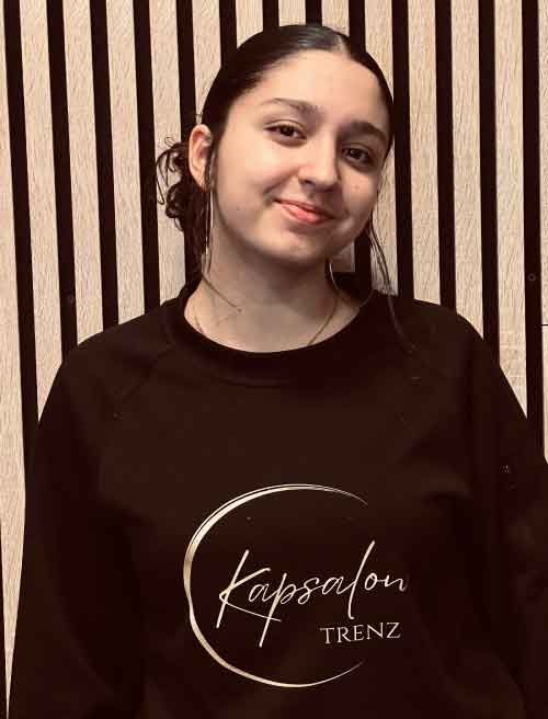 NINA is 18 jaar, woont in Eelderwolde, zit in het tweede jaar van de kappersopleiding (Euroborg, Noorderpoortcollege) en loopt stage bij kapsalon Trenz in Groningen. Nina wil graag allround kapper worden en zoveel mogelijk leren van het kappersvak. Ze vraagt elke stagedag wel iets aan de collegaatjes bij Trenz en ze is heel blij met alle zorgvuldige en uitgebreide uitleg die ze dan krijgt. Ze wil het naadje van de kous weten en is erg leergierig. De focus in de opleiding ligt op dameskapsels maar als ze dat onder de knie heeft wil ze ook heel graag bij Trenz de herenkapsels leren knippen. Ze heeft ook al highlights mogen zetten en zelfs extensies bij een collegaatje. Nina voelt zich echt op haar plek bij Kapsalon Trenz en hoopt dat ze tijdens haar opleiding stage mag blijven lopen bij Trenz en daarna? Het liefst een werkplek bij Trenz natuurlijk.